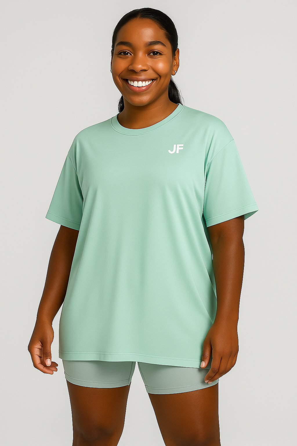 Stay cool, confident, and unrestricted in motion with our Oversized Performance Tee. Made with a premium blend of 87% nylon and 13% spandex, this shirt offers a smooth, lightweight feel that moves with you — perfect for workouts, recovery, or laid-back weekends. Featuring a relaxed, drop-shoulder fit and minimal JF logo detail at the chest, it delivers effortless style with functional performance.